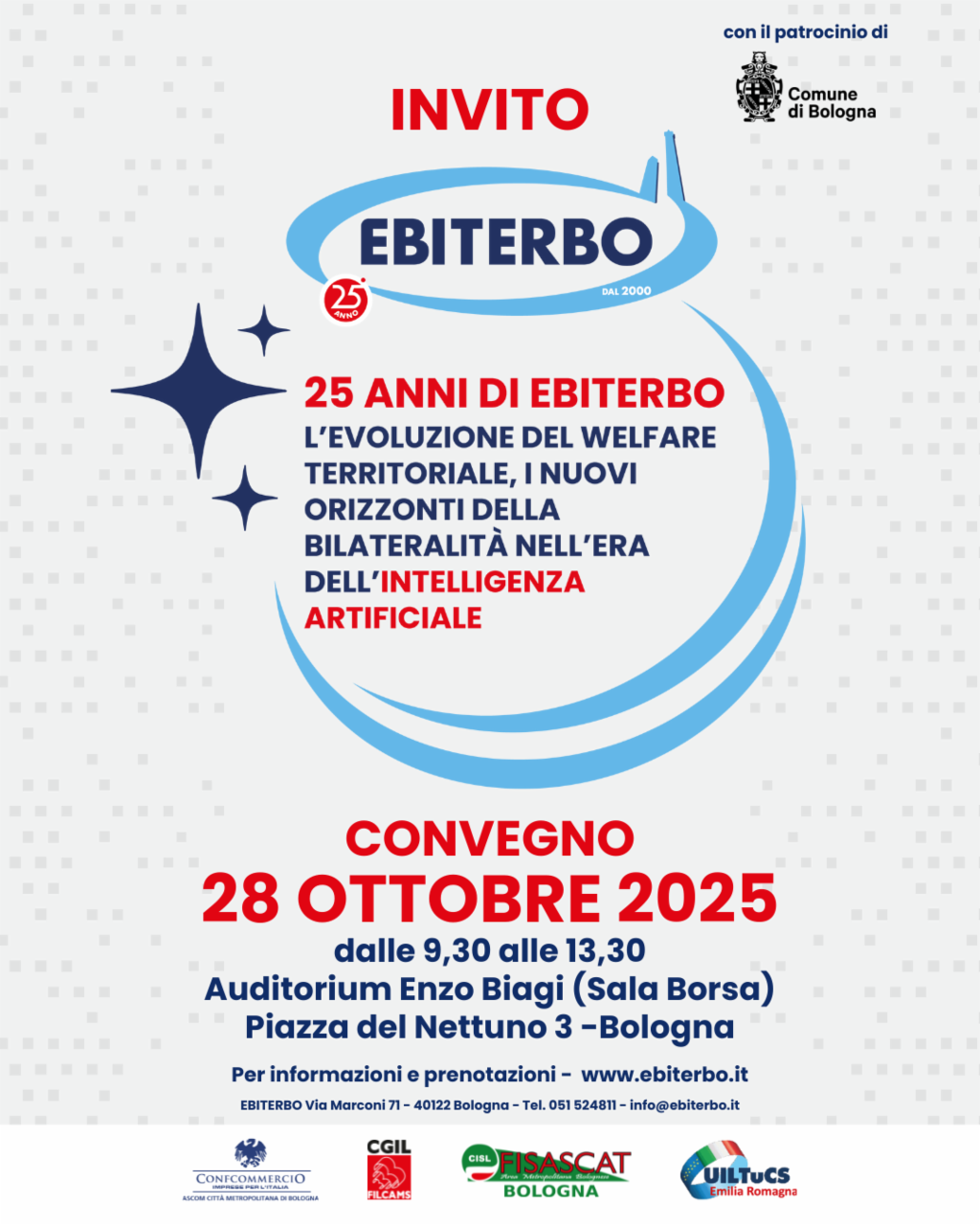 In occasione dei 25 anni di attività, Ebiterbo organizza il Convegno dal titolo: “25 anni di Ebiterbo: l’evoluzione del welfare territoriale, i nuovi orizzonti della bilateralità nell’era dell’intelligenza artificiale", che si terrà il 28 ottobre 2025, dalle ore 9.30 alle ore 13.30, presso Auditorium Enzo Biagi - Sala Borsa - Piazza del Nettuno 3 - Bologna.